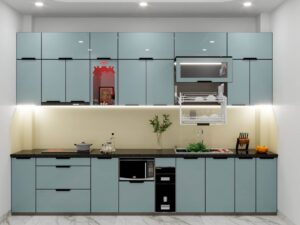 Cánh kính sang trọng: Cánh tủ được làm từ kính, thường là kính cường lực, mang lại vẻ đẹp hiện đại và sáng bóng. Kính có khả năng chống trầy xước và dễ dàng lau chùi, đồng thời tạo cảm giác không gian bếp rộng rãi hơn nhờ khả năng phản chiếu ánh sáng tốt.